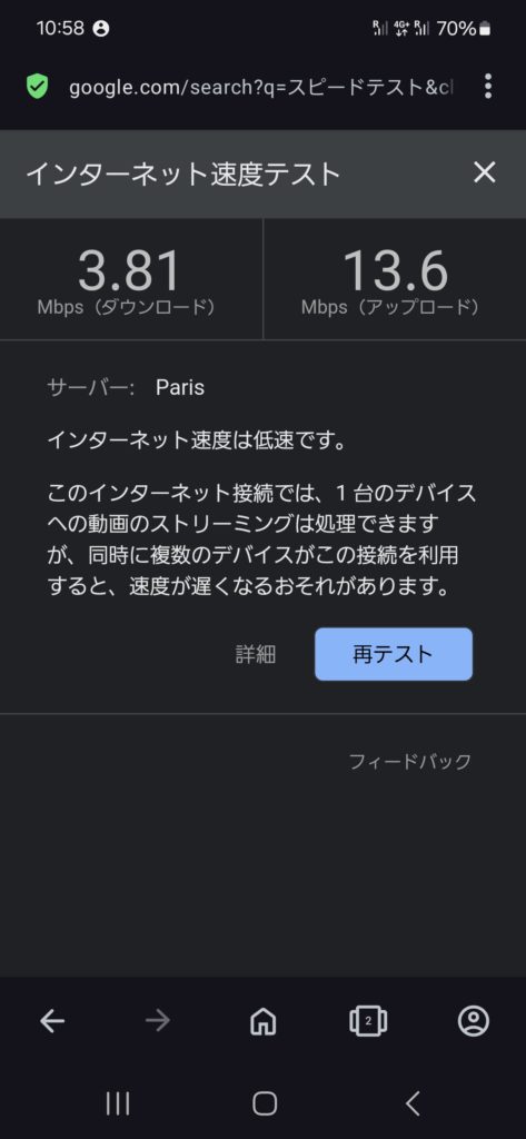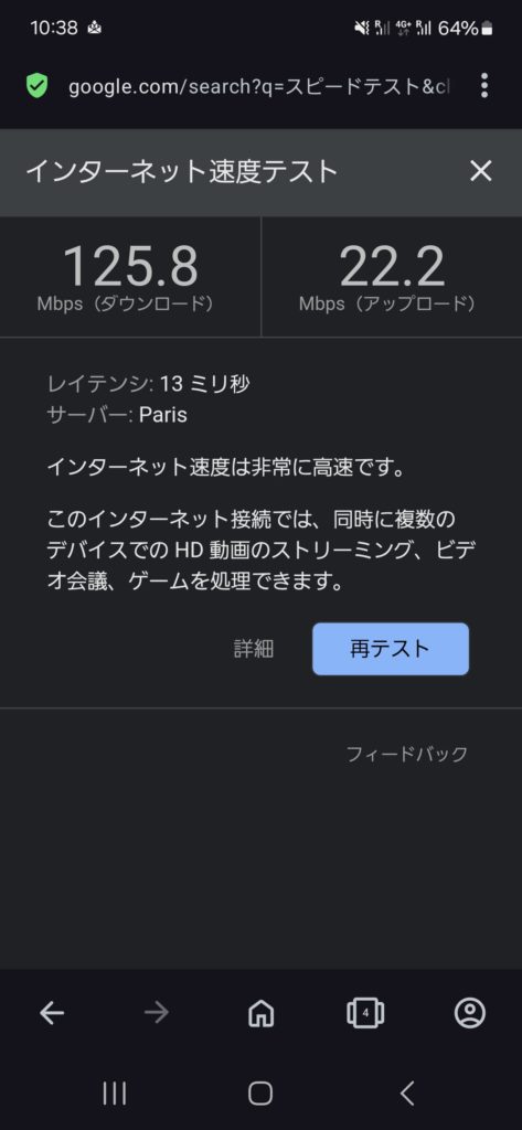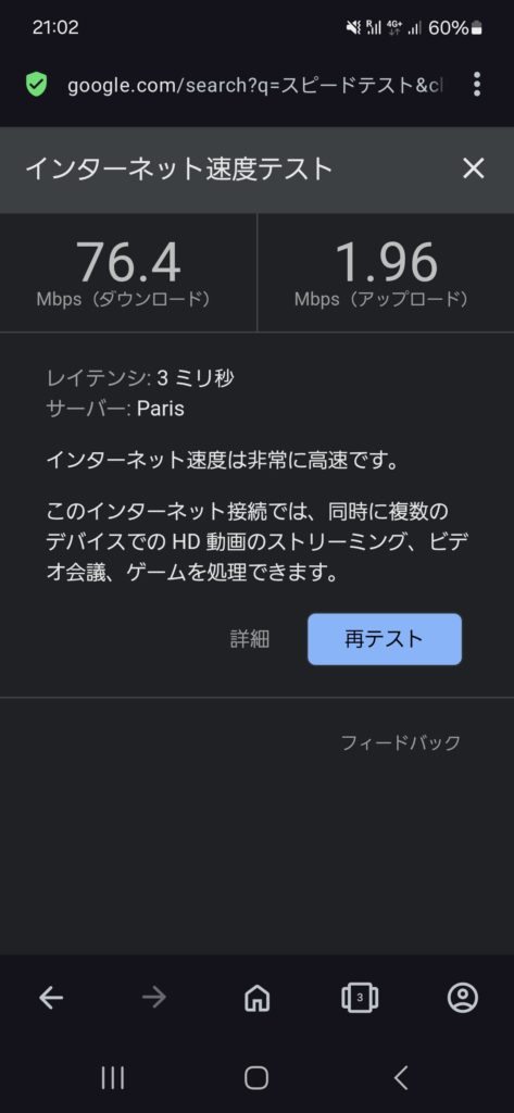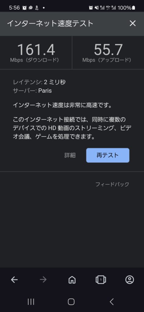 ・フランクフルトでのサーバーはパリであったが、通信速度は非常に速かった