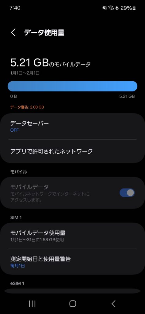 | 携帯の設定 | アクティベート状態で、SIMマネージャー(Galaxy携帯)は以下の設定が確認できた。 【優先SIM】 ・通話 ⇒ SIM1(日本の携帯会社SIM) ・メッセージ ⇒ SIM1(日本の携帯会社SIM) 認証コード受信時に必要 ・モバイルデータ ⇒ SIM2(eSIM) 妻のiphoneも特に問題なく設定ができた。 |