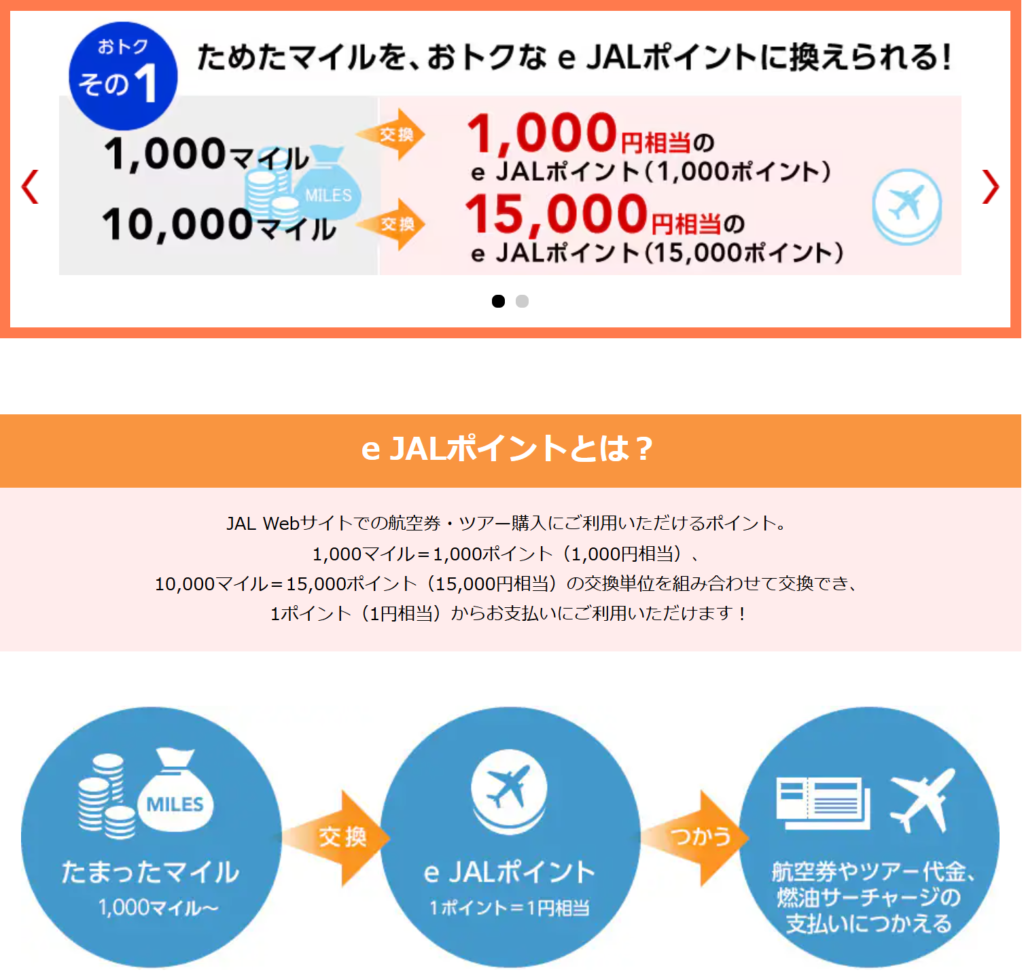 そこで、もう少し調べたところ、JALマイルをeJAL ポイントに変換すると、10,000マイル=15,000円 相当に変換できることが判明